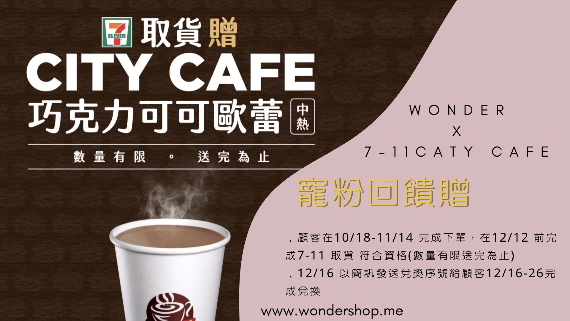 於活動時間內 ( 2021 年 12 月 6 日起至 2022 年 1 月 9 日止 ) 完成下訂並於 2022 年 2 月 6 日 23:59 前在 7-ELEVEN 完成取件者,即享有獲取資格 ( CITY CAFE熱太妃焦糖風味瑪奇朵 中杯),贈送對象將於 2021 年 2 月 10 日起至 2022 年 2 月 20 日止依實際完成取貨順序發放,因數量有限,如未獲贈不另通知。